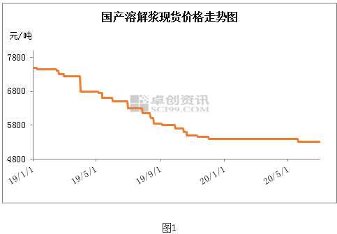 2020年上半年溶解漿價格窄幅下行,國產(chǎn)闊葉溶解漿含稅到廠價均價5377元/噸,較去年同期下降23%。從圖1可以看出今年上半年變化幅度不大,去年四季度漿價已降至近五年新低,來到國產(chǎn)漿廠生產(chǎn)成本線附近,幾無調(diào)價空間。2020年一季度受到公共衛(wèi)生事件影響,溶解漿市場交投清淡,國產(chǎn)漿成交價低位盤整。二季度終端出口訂單減少,溶解漿市場延續(xù)弱勢運行,漿價承壓窄幅下行,5月份國產(chǎn)闊葉溶解漿含稅到場價下探至5300元/噸。漿價持續(xù)低迷原因是: