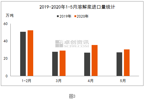 進口木漿價低量足:如圖2所示,進口闊葉溶解漿外盤走勢基本與國產(chǎn)溶解漿同步,2019年四季度紙2020年一季度持穩(wěn)于630美元/噸附近,根據(jù)當時人民幣匯率計算,一季度闊葉進口成本在5050-5200元/噸;二季度因人民幣匯率持續(xù)貶值,進口成本增加,粘短廠家壓價采買,闊葉漿外盤連續(xù)下調(diào)至610美元/噸,二季度闊葉漿進口成本進口成本在5000-5230元/噸。由此可見進口溶解漿價格一直低于國產(chǎn)闊葉漿,粘短廠家傾向采買外盤來降低成本。那進口溶解漿供應情況又怎么樣呢,如圖3是近兩年1-5月進口量對比圖,可以看到2020年各月進口量均多于2019年,前五個月進口量148萬噸,同比增長12%,進口漿價低量足擠壓國產(chǎn)溶解漿銷售空間。
