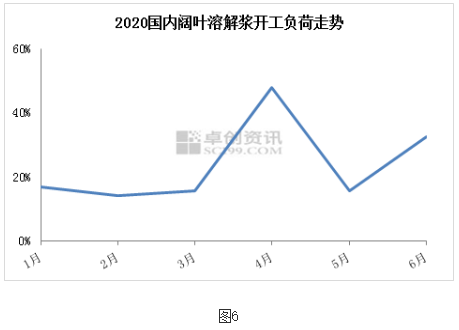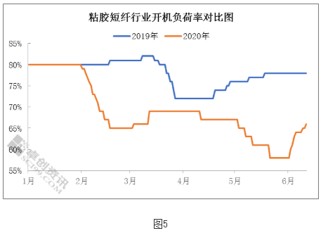 粘短開工率低于同期:如圖5所示,2020年粘短行業(yè)開工負荷明顯低于去年同期,一季度主要受國內(nèi)公共衛(wèi)生事件和春節(jié)假期影響,二季度則是市場需求收緊,且價格走低,開工偏弱整理,溶解漿消耗量減少,采買周期延長。