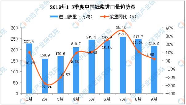 2019年1-3季度中國(guó)紙漿進(jìn)口量逐漸增長(zhǎng),增長(zhǎng)29.63%。2019年9月中國(guó)紙漿進(jìn)口量為216.2萬(wàn)噸,同比增長(zhǎng)1.9%。