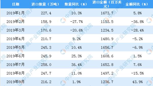 2019年1-9月中國(guó)紙漿進(jìn)口數(shù)量及金額增長(zhǎng)率情況