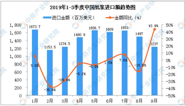 從金額方面來(lái)看,2019年9月中國(guó)紙漿進(jìn)口金額為1237百萬(wàn)美元,同比增長(zhǎng)43.9%。