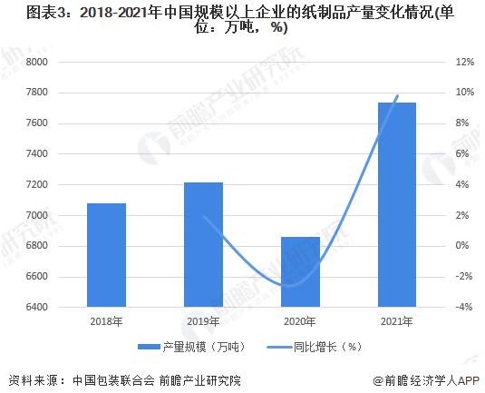 2020年受新冠疫情的影響,全國規模以上企業紙制品產量同比下降2.4%;2021年,全國規模以上企業紙制品產量達到7739萬噸左右,同比增長9.8%,超過2019年全年水平。