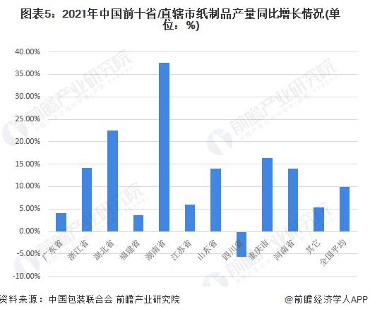 從在2021年,國內前10省/直轄市紙制品產量增速來看,除了四川省,其他9省均為正增長,其中湖南省的增幅******,超過30%。